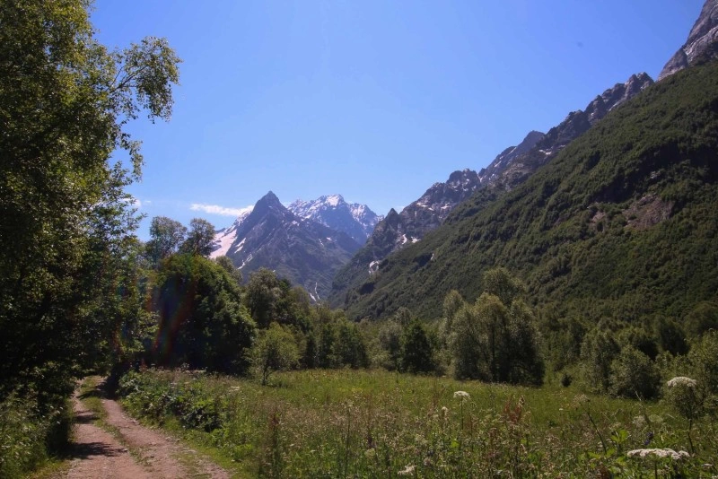 С Русской поляны открываются захватывающие виды на вершины Домбай-Ульген, Мусса-Ачитара, Джугутурлучат и Театральный пик. Место отличается тишиной и спокойствием, где можно насладиться пением птиц и шумом ветра. Разнообразная фауна, в том числе зайцы и ручные белки, которые охотно принимают орехи.